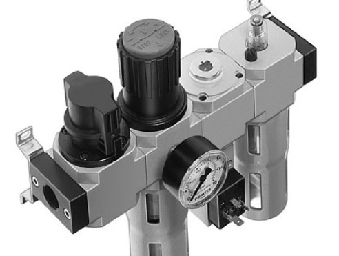 气源三联件是*基本的气动元件,所谓三联件,就是空气过滤器,调压阀和油雾器组成。用于除去压缩空中的小颗粒,水汽,油雾,以保护用气设备,需要定期对滤网进行清理以及倒掉分离的油和水。三联件还能对气体压力进行调节,一般设备的气压需要保持在5~6公斤左右。